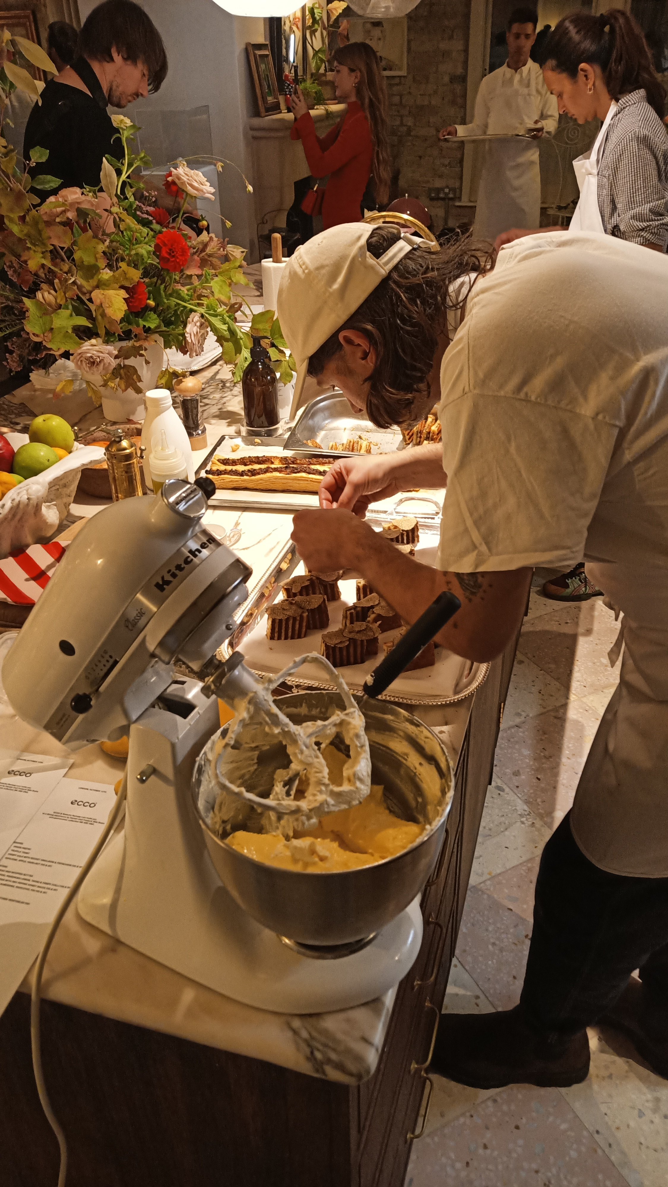 House party with Chef Frederik Bille Brahe cooking on the kitchen island.